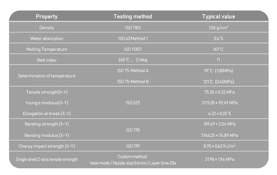 PA12+CF is made using a specialty Nylon 12 [PA12] and high-modulus carbon fiber. This material offers an excellent combination of performance and printability. PA12 absorbs much less moisture than PA6-based materials and has superior retention of mechanical properties after exposure to humid environments.